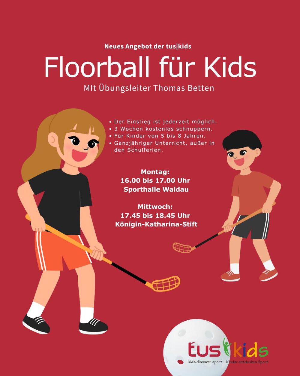 Floorball, auch bekannt als Unihockey, ist ein dynamischer Mannschaftssport, der Elemente aus Eishockey und Feldhockey vereint. Ziel ist es, mit einem Kunststoffschläger den Ball ins gegnerische Tor zu bringen. Unser Angebot kids|Floorball richtet sich an Kinder von 5 bis 8 Jahren und vermittelt Spiel und Bewegung auf spielerische Weise ohne Leistungsdruck. Unter der Anleitung unseres erfahrenen Übungsleiters Thomas Betten lernen die Kinder erste Grundlagen dieser Sportart, fördern ihre Hand-Auge-Koordination und haben vor allem eins: Spaß! Der Einstieg jederzeit möglich. Ihr Kind kann 3 Wochen kostenlos schnuppern und testen, ob Floorball ihm bzw. ihr Spaß macht. Optimale Gruppengröße: max. 18 Kinder. Wir bieten qualifizierte Betreuung durch erfahrene Übungsleiter. Trainingszeiten: Montag 16.00 - 17.00 Uhr, Sporthalle Waldau Mittwoch 17.45 - 18.45 Uhr, Königin-Katharina-Stift
