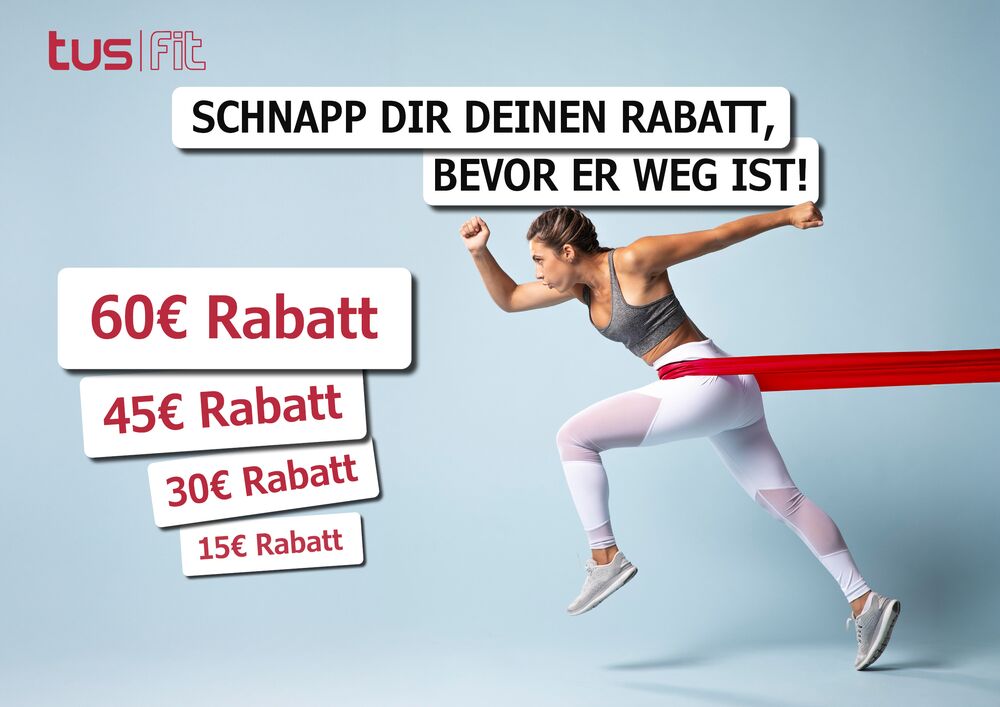 Melde dich im Oktober 2025 in unserem vereinseigenen Fitnessstudio tus|fit an und spare bis zu 60,-€ auf deine Beitragsgebühren. Schnell sein lohnt sich! Dein Rabatt in der Übersicht: Anmeldezeitraum 01.10.2025 – 12.10.2025: 60 € Rabatt Anmeldezeitraum 13.10.2025 – 19.10.2025: 45 € Rabatt Anmeldezeitraum 20.10.2025 – 26.10.2025: 30 € Rabatt Anmeldezeitraum 27.10.2025 – 02.11.2025: 15 € Rabatt Melde dich jetzt direkt an oder kontaktiere uns für einen Beratungstermin (0711 / 97 661-50), an dem du unser Studio testen, das professionelle Trainerteam kennenlernen und die modernen Geräte ausprobieren kannst.